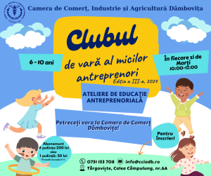 Alătură-te Clubului de Vară al Micilor Antreprenori de la Camera de Comerț Dâmbovița, unde copiii vor #învăța, #experimenta și #dezvolta abilități esențiale pentru a deveni lideri de succes!