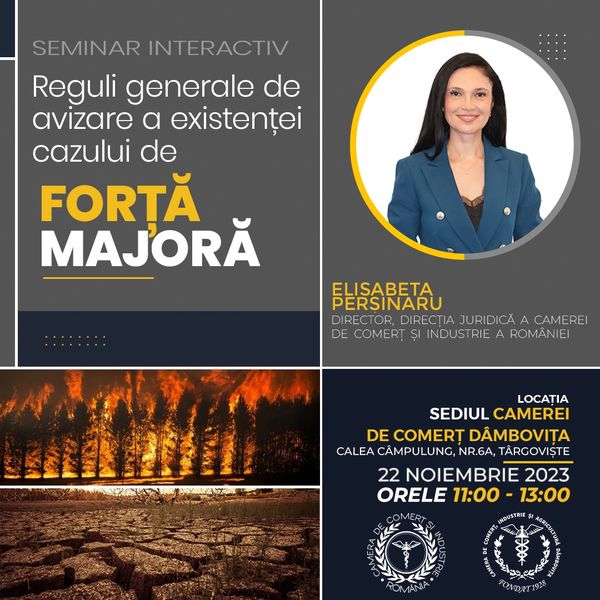 Astăzi, 22 noiembrie 2023, la sediul Camerei de Comerț, Industrie și Agricultură Dâmbovița a avut loc, în format hibrid, seminarul interactiv cu tema: ,,Reguli generale de avizare a existenței cazului de forță majoră’’! Seminarul a fost susţinut de Elisabeta Persinaru, Director Direcția Juridică a Camerei de Comerț și Industrie a României.
