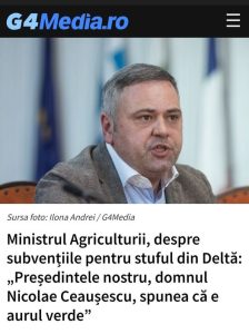 ,,Următorul citat va părea ireal, chiar și pentru guvernul PSDNL. Din păcate nu e. „Președintele nostru, domnul Nicolae Ceaușescu, nu spunea degeaba că stuful e aurul verde al României”. Atenție, „președintele NOSTRU” și „DOMNUL” – ca să fie clar pentru toată lumea. Cuvintele îi aparțin ministrului agriculturii, Florin Barbu. Ministru al agriculturii ÎN FUNCȚIE.