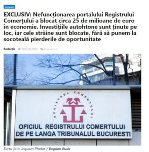 ,,A (mai) trecut o săptămână de când trăgeam un semnal de alarmă cu privire la nefuncționalitatea noii platforme ONRC. Ce s-a întâmplat în acest timp? Ei bine, vinovații continuă să nu fie trași la răspundere. Din păcate, firește, un rău nu vine niciodată singur, drept care, conform estimărilor specialiștilor, aproximativ 25 de milioane de Euro au ajuns să fie blocați în economia românească. Până acum.
