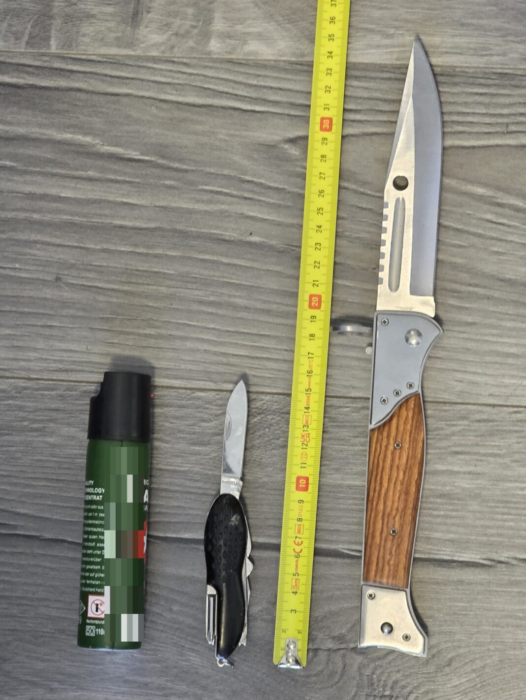 Cu ocazia solicitării accesului în instituția publică, jandarmul a efectuat controlul bagajului, ocazie cu care au fost descoperite un cuțit pliabil tip baionetă, un briceag multifunctional și un spray cu efect iritant lacrimogen. Fiind întrebată de ce deține obiecte interzise, femeia, în vârstă de 21 de ani, a afirmat că le poartă pentru autoapărare.