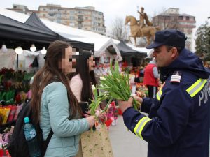 Jandarmii, polițiștii și pompierii dâmbovițeni au dăruit flori doamnelor și domnișoarelor care au trecut prin Parcul Mitropoliei din centrul municipiului Târgoviște.