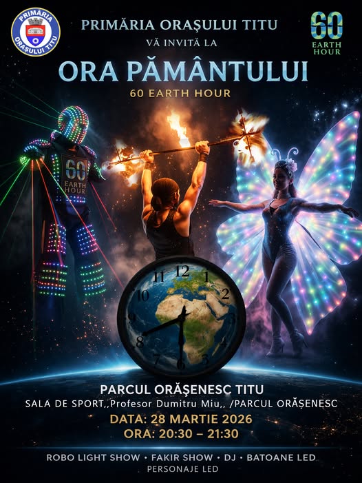 Primăria Orașului Titu îi invită pe cetățeni să participe sâmbătă, 28 martie 2026, în intervalul orar 20:30 – 21:30, la ,,Ora Pământului’’, eveniment devenit deja tradiție care va avea loc în Amfiteatrul din Parcul Orășenesc Titu! Organizatorii transmit că dacă vremea nu va permite desfășurarea în aer liber, evenimentul se va muta în Sala de Sport „Prof. Dumitru Miu”.
