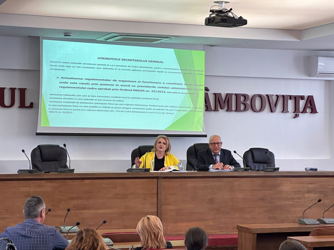 Prefectul Claudia Gilia s-a întâlnit cu secretarii generali ai unităților administrativ – teritoriale dâmbovițene, în Sala Unirii a Consiliului Județean. La ședința de îndrumare au fost prezenți reprezentanții a 84 dintre cele 89 de U.A.T.-uri. Ședința a fost convocată cu scopul de a îndruma și îmbunătăți activitatea secretarilor generali din primăriile din județ. Subiectele abordate au acoperit teme ce țin de activitatea secretarilor generali, soluții privind rezolvarea problemelor cu care aceștia se confruntă și propuneri privind îmbunătățirea unor acte administrative.