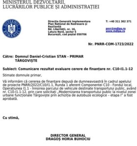 Este oficial! Este o veste uriașă transmisă de primarul municipiului Târgoviște, Cristian Stan care îi vizează pe târgovișteni dar și pe cetățenii din localitățile limitrofe Târgoviștei! Încă 68.000.000 lei din fonduri europene și un pas uriaș pentru transportul public local, inclusiv din zona periurbană a municipiului Târgoviște! Ministerul Dezvoltării, Lucrărilor Publice și Administrației a comunicat municipalității târgoviștene faptul că cererea de finanțare având ca obiect investiția „Modernizarea transportului public la nivelul zonei urbane funcționale Târgoviște prin achiziția de autobuze ecologice – etapa I” , proiect care vizează extinderea transportului public cu autobuze noi, moderne, la întreaga zonă funcțională a municipiului Târgoviște (25 de unități administrativ teritoriale), A FOST APROBATĂ.